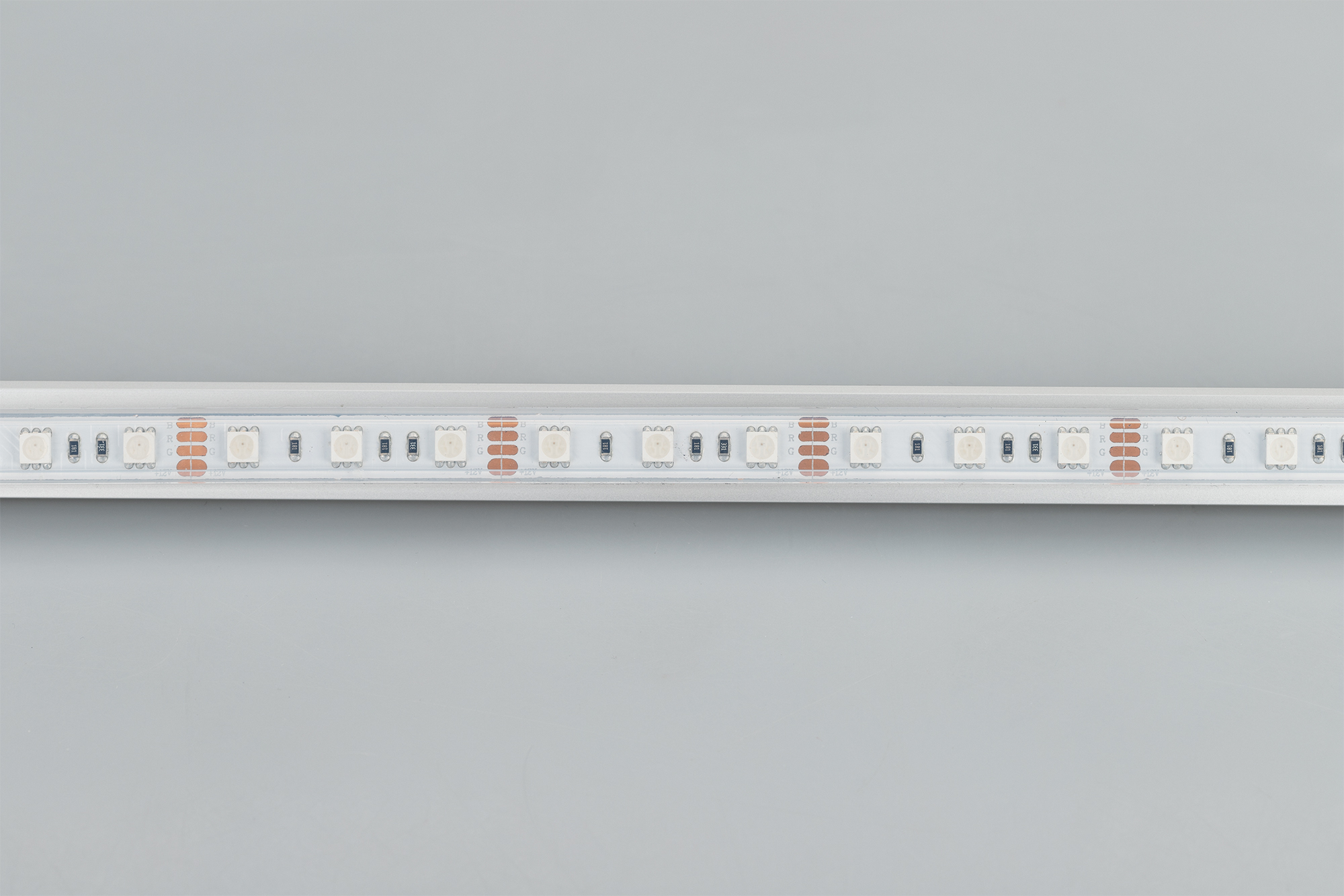 Герметичная лента IP66 (в силиконовой трубке), светодиоды smd 5060, 60шт/м (300шт на 5м), белая плата 10мм, скотч 3М. Цвет Мультицвет R/G/B. Питание 12V, мощность 14.4 Вт/м (72 Вт на 5м), угол 120°. Размеры 5000х13x5мм. Мин.отрезок 50мм, 3 светодиода. Цена за 1м.