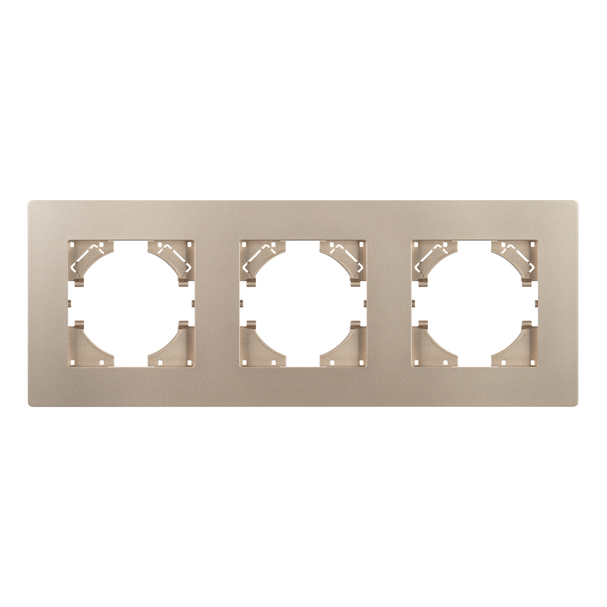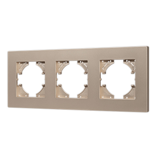 Рамка пластиковая на 3 поста, под встраиваемый механизм. Цвет - золотой. Среднего уровня герметичности IP20. Ориентация монтажа - горизонтальная (основным ориентиром служат посадочные выступы для накладки механизма).